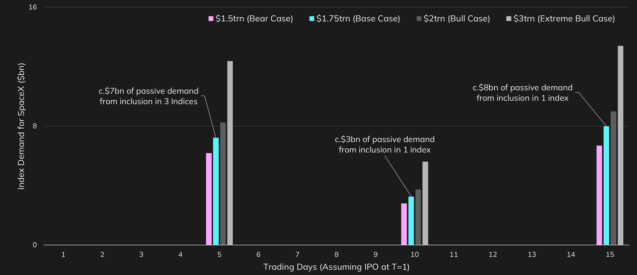 We assume four valuation scenarios based on day-one trading performance: a $1.5tn bear case (~15% decline), a $1.75tn base case (flat), a $2tn bull case (~15% upside), and a $3tn extreme bull case (~70% upside), with market cap then holding at those levels over the following week. These scenarios drive varying levels of passive demand.