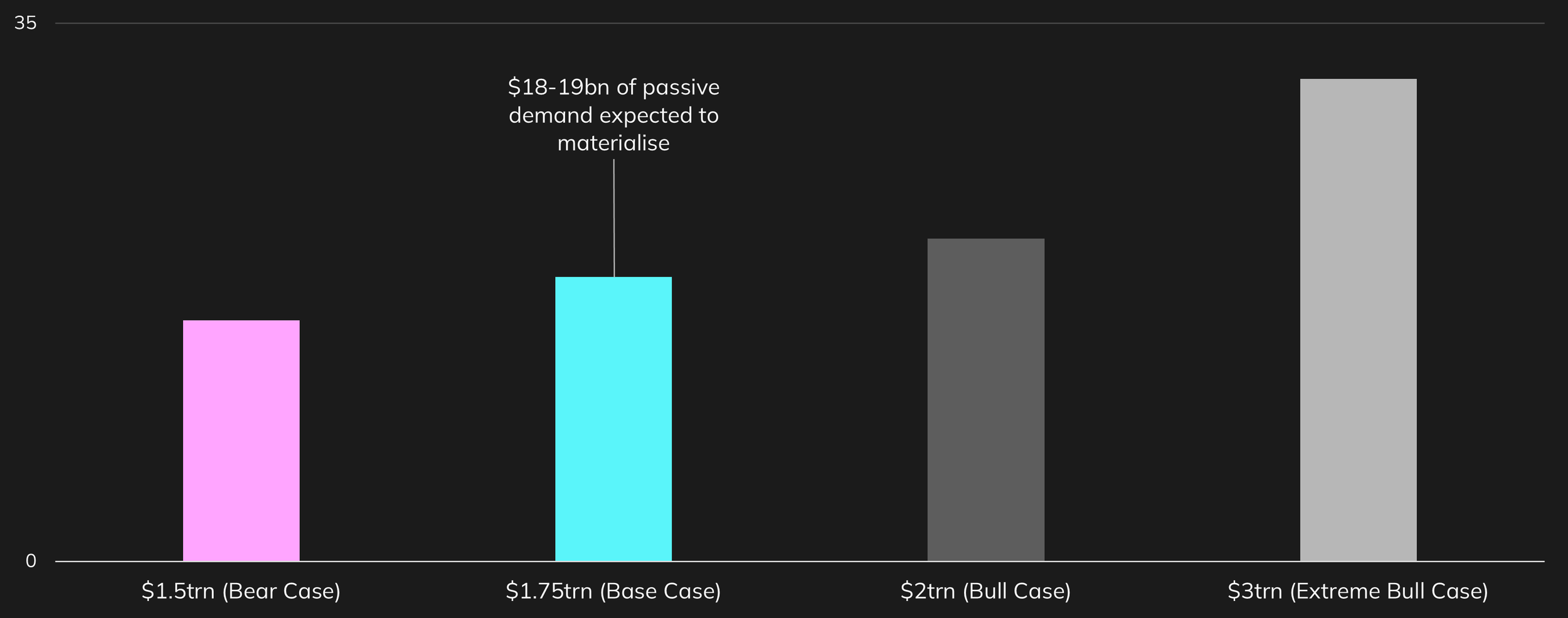 At a consensus market cap of $1.75trn, our base case models c.$18-19bn of total potential passive demand to materialise within 15 trading days, reflecting inclusion across the major cap weighted indices. Timing will vary, with flows materialising at different points post-IPO depending on index-specific methodologies.