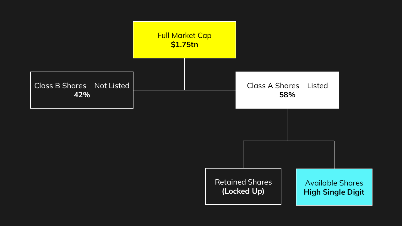 SpaceX is targeting an end-of-June Nasdaq listing at a company market cap of $1.75-2.00tn, with an IPO offer size of c$75bn. Based on public estimates of Elon Musk's ownership stake at 42%, we assume a dual class listing with 58% listed as Class A and Musk’s 42% remaining unlisted as Class B.